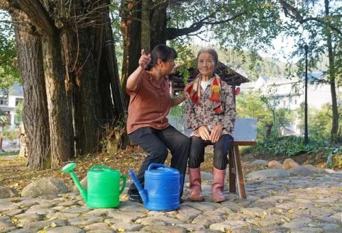 這是在江西省鉛山縣陳坊鄉沽溪村,羅細英(左)與一位相識的老人聊天(9月28日攝)。新華社記者 萬象 攝