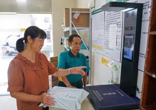 這是在江西省鉛山縣陳坊鄉郵政代辦所,羅細英(左)體驗新更換的無人自動出庫設備(9月28日攝)。新華社記者 萬象 攝