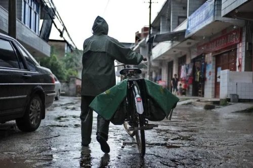 這是在江西省鉛山縣陳坊鄉,羅細英冒著大雨騎車出發去送郵件(2011年7月19日攝)。新華社記者 周密 攝