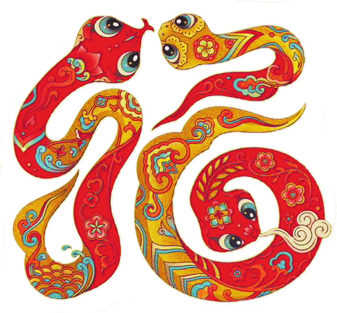 在生肖動物里,蛇的設計難度是比較大的。蛇的形象具有兩面性,它有著吉祥的象征寓意,外形卻又容易讓人產生畏懼感。那么,如何讓設計的蛇的形象能夠被大眾接受,是我這次創(chuàng)作面臨的主要挑戰(zhàn)。我希望塑造的蛇是對人親近的,是活潑可愛、圓潤豐滿的,所以就通過靈動的線條和姿態(tài)來表現(xiàn)其造型,在畫面上實現(xiàn)傳統(tǒng)與現(xiàn)代審美之間的平衡。