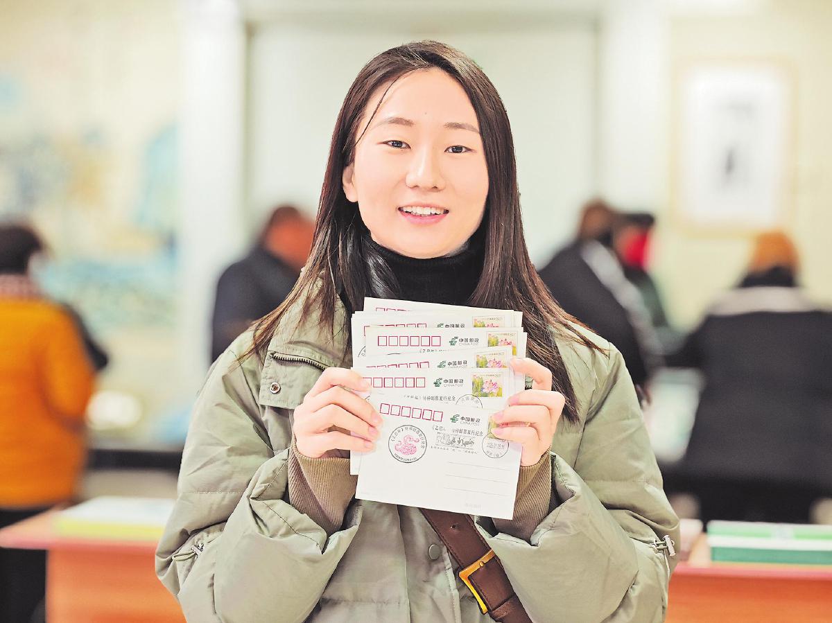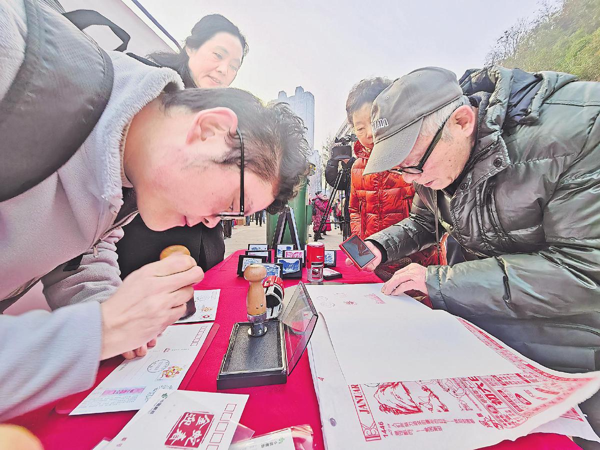 河南省南陽市郵政分公司多個網點聯動開展生肖蛇票發行活動,啟用《乙巳年》特種郵票發行紀念戳和蟒泉臨時郵局紀念戳,免費為廣大集郵愛好者加蓋。在南陽市仲景路集郵專賣店,郵迷捧著加蓋郵戳的紀念封欲寄給親朋好友,傳遞新年祝福。□劉力揚 攝
