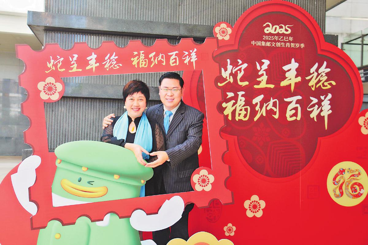 海南省郵政分公司聯合海南省博物館舉辦《乙巳年》特種郵票首發式。圖為郵迷在活動現場打卡留念?! 觞S文燕 李慧 攝