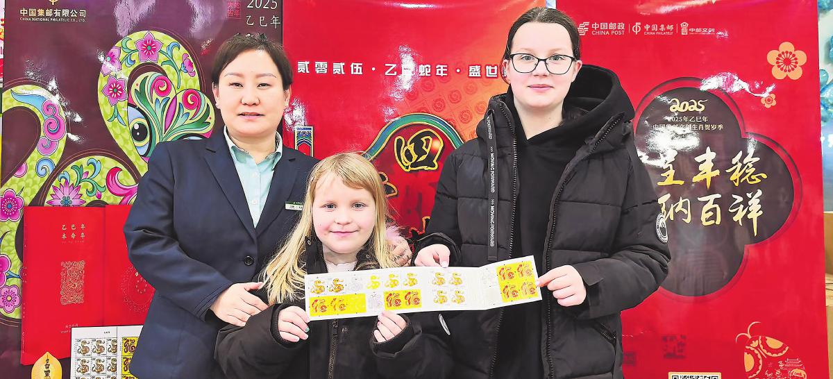 在黑龍江省雞西市郵政分公司郵電大廈營業所的生肖蛇票首發現場,來自俄羅斯的一家四口購買蛇年郵票和明信片并郵寄給遠在故鄉的家人。營業人員與可愛的俄羅斯小朋友合影留念?!醣R明琴 攝