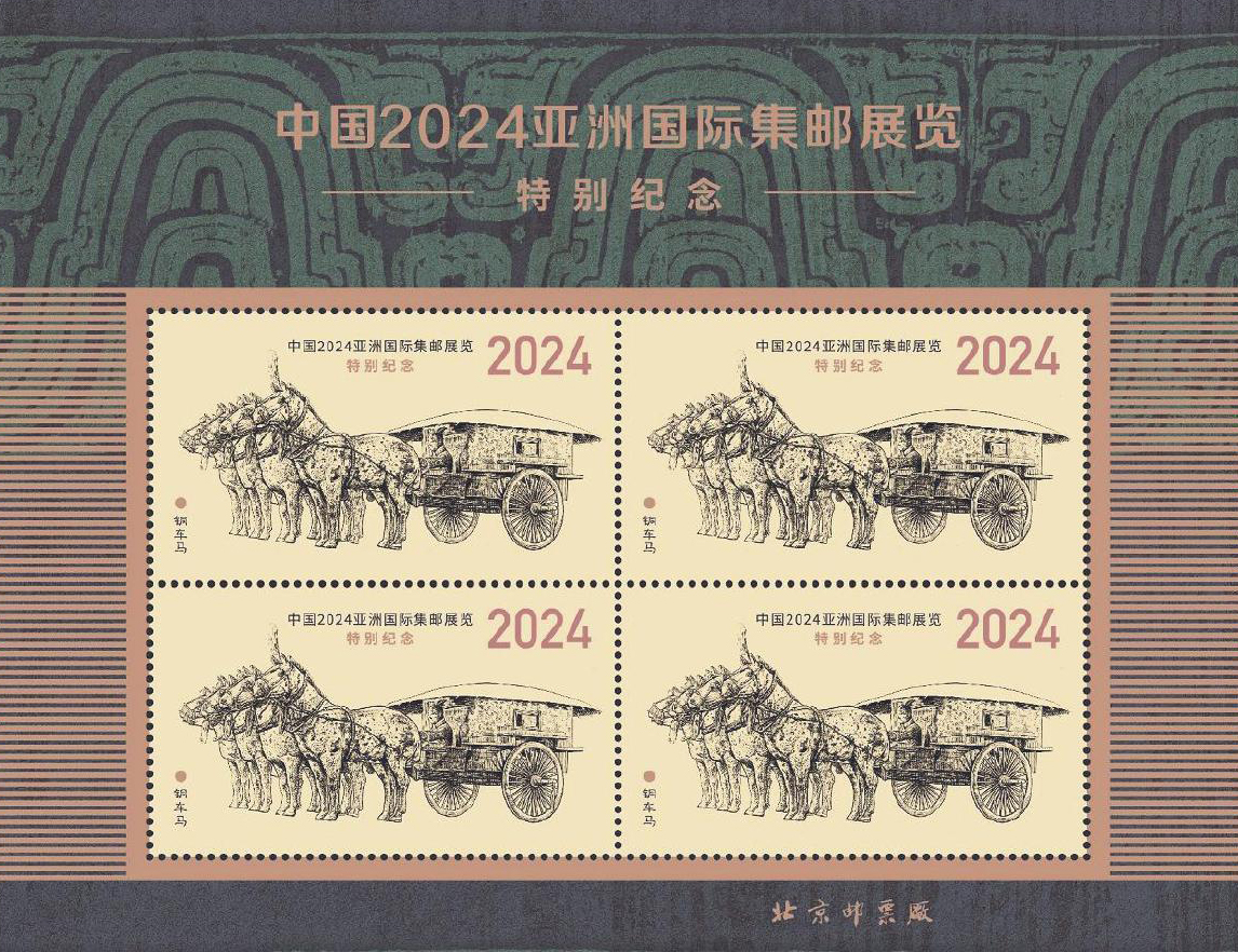 主圖選定后,北京郵票廠(chǎng)設(shè)計(jì)師夏競(jìng)秋負(fù)責(zé)紀(jì)念張的整體設(shè)計(jì)工作。整版紀(jì)念張采用四方聯(lián)的雙聯(lián)張形式,首次以帶測(cè)控條的完整原始印張呈現(xiàn)。作為《中國(guó)2024亞洲國(guó)際集郵展覽》紀(jì)念郵票第1枚“鼎啟新章”的設(shè)計(jì)者,夏競(jìng)秋選用上海博物館鎮(zhèn)館之寶——大克鼎器身花紋作為邊飾,色彩厚重古樸,與主體銅車(chē)馬雕刻圖案相互襯托,互為呼應(yīng),彰顯出濃重的歷史文化特色。