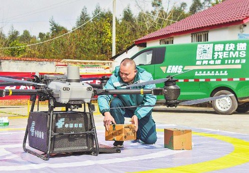 如果說深山高原的無人機運郵是“雪中送炭”,那么城市周邊鄉村的無人機投遞則是“錦上添花”。在成都,邛崍和彭州兩市相繼開通常態化無人機郵路,使輕小郵件“朝發夕至”,目前累計投遞報刊6000余份、包裹400余件。在自貢市榮縣,無人機郵路開通后,涼水井村至高山鎮的郵件雙向流通時間節約了40分鐘,村民網購的商品和寄遞的土特產實現高效流轉。