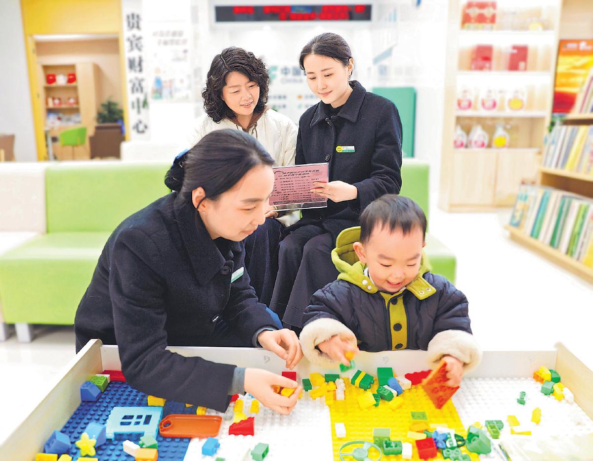 “奶奶您看,我搭的消防車?!奔稳鸫蟮类]政所內,一個小男孩正舉著積木興奮地向湯女士展示。在網點廳堂右側的等候區,這樣的場景每天都在上演。玩具區內堆滿樂高積木、繪本架上整齊排列著適齡讀物、小桌子上擺放著彩色蠟筆——這個占據網點30%空間的“童心驛站”,是有娃家庭辦理業務時的“打卡地”。