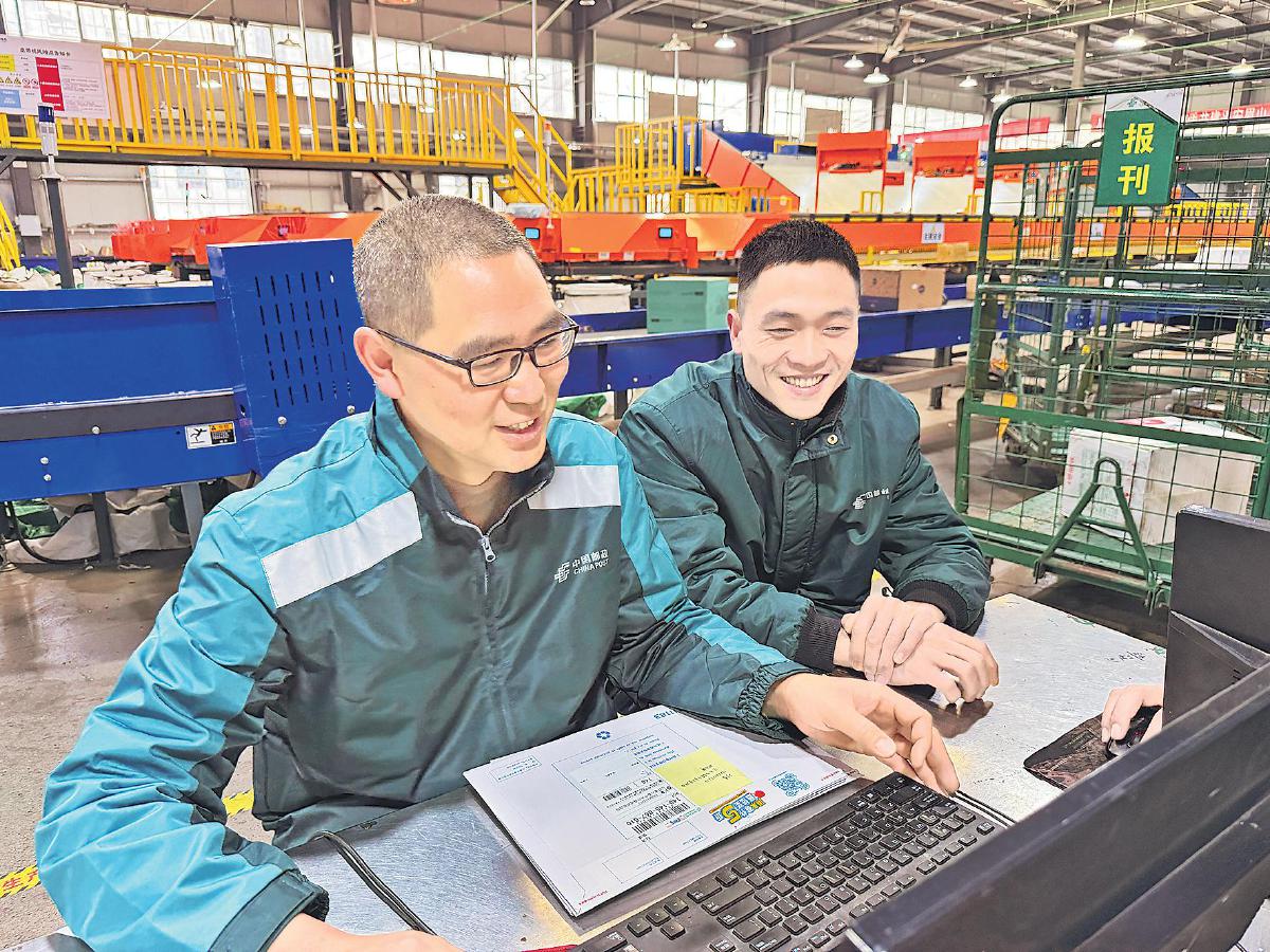 為驗證想法的可行性,邱文波利用休息時間和同事一起調整傳送帶的分發程序設置,并在傳送帶兩側設置分揀區域,一邊是城區郵件分揀區,另一邊是鄉鎮郵件的暫存區。兩周后,原本需要5名分揀員協作的工作,3人即可完成,效率提升近40%。“以前分揀城區、鄉鎮的包裹需要很長時間,現在重新調整了分揀流程,不僅分揀效率提高了,后續鄉郵封發組的工作也輕松了。”負責封發的何靜波感慨道。