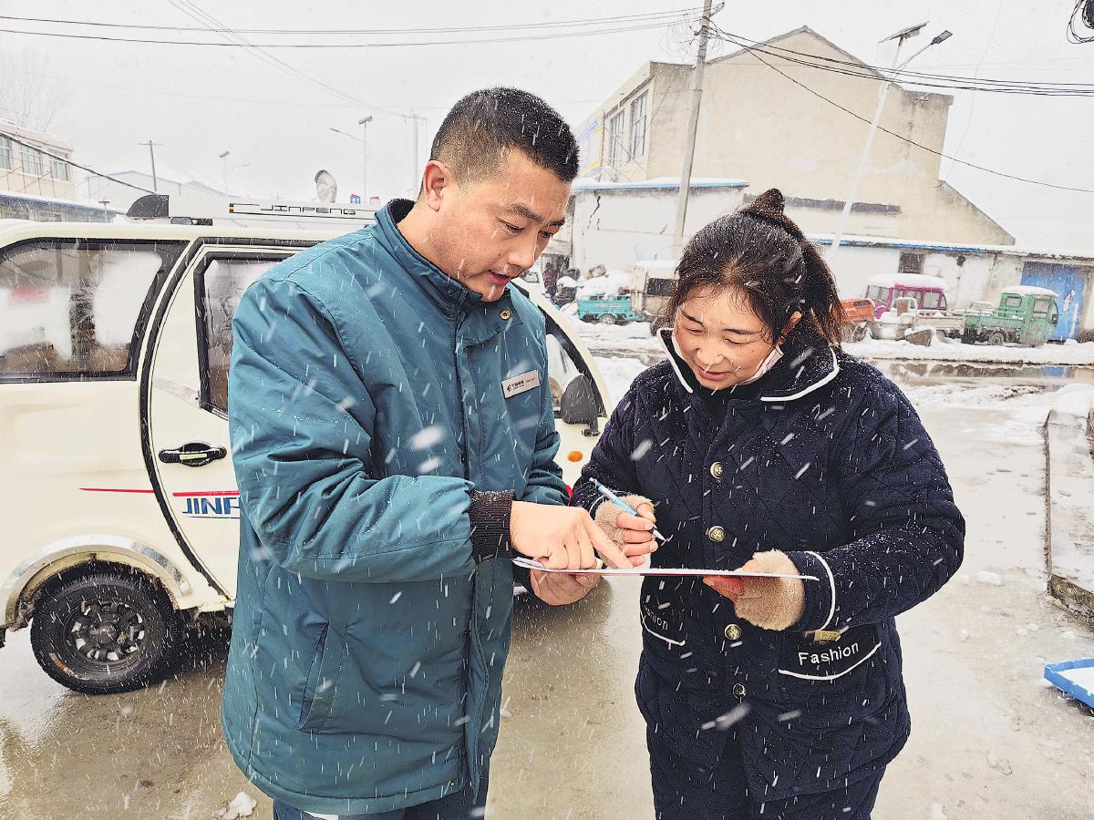 風雪中,劉雷鋒為客戶投遞急需的證件。
