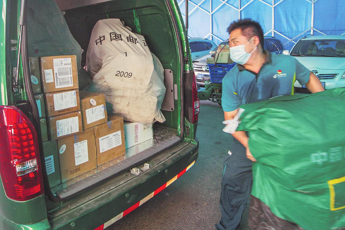 徐龍將郵件裝進郵車。