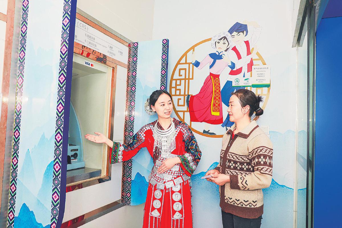 濯水鎮支行員工身著土家族傳統服飾為客戶服務。