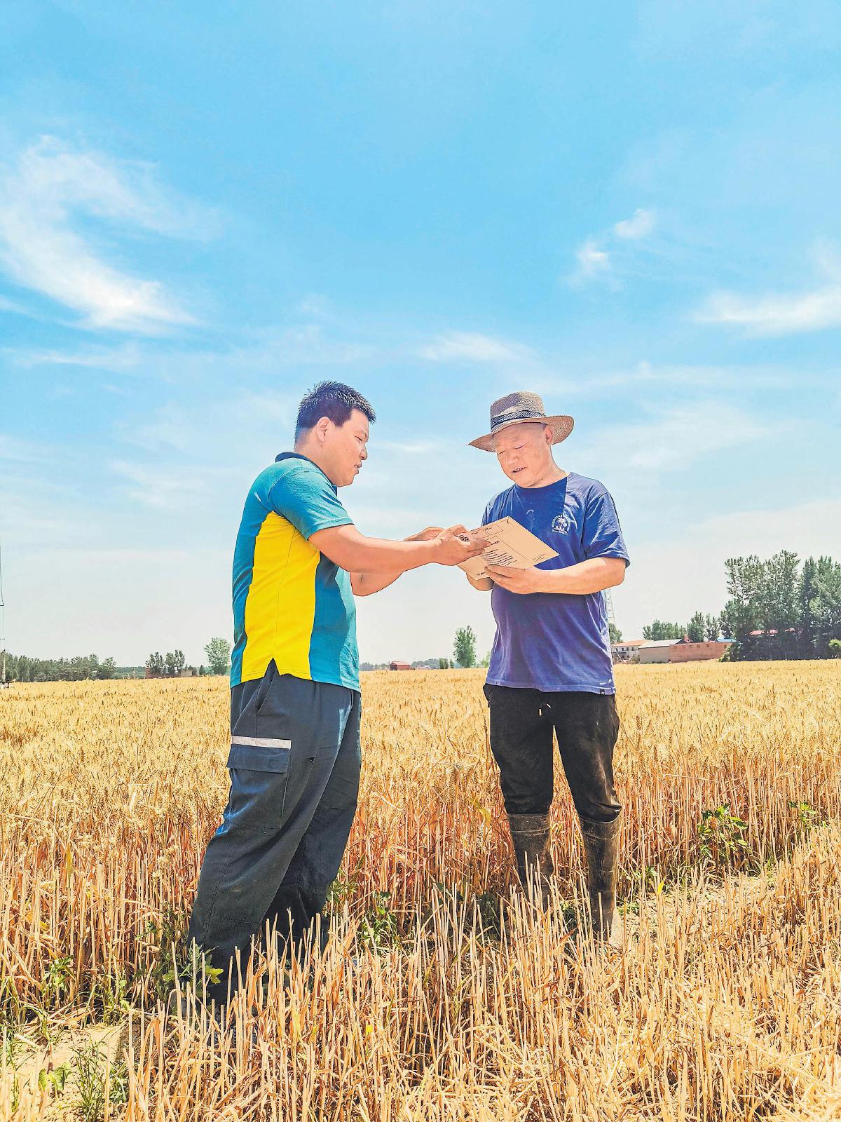 郵政“夏收服務隊”隊員為收割機手送上飲用水、草帽等防暑降溫用品。