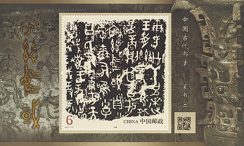 該套郵票精選5件文物,通過其青銅銘文與石刻文字拓片,傳遞千年篆韻。郵票采用膠雕套印工藝,內(nèi)圖底色通過立體雕刻紋路模擬拓印效果和質(zhì)感,邊飾顏色模擬紙張紋路,使郵票內(nèi)容更貼近真實拓印效果。小型張采用影寫印刷工藝,畫面清晰,層次豐富,通過全專色分色印刷提高郵票防偽性;圖內(nèi)“中國”二字設(shè)計為熒光效果,郵票邊飾“宅茲中國”采用金色直壓工藝,通過紋理效果體現(xiàn)青銅器歷史感,右側(cè)青銅器用色沉穩(wěn),層次鮮明,體現(xiàn)出“何尊”的神秘厚重感。