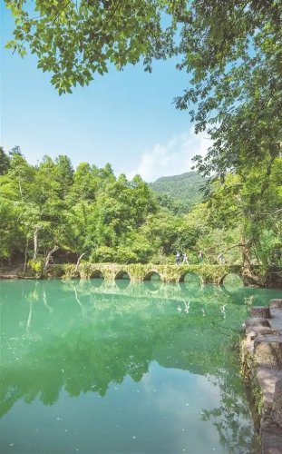 正午的陽光灑向荔波小七孔橋畔,藍綠色的湖水靜若綠寶石,七孔古橋如弦月橫臥碧波之上,橋孔與倒影相映成環。嶄新的旅游大巴載著來自廣東、江蘇等地的游客駛入這片山水,感嘆聲與快門聲立即響成一片。