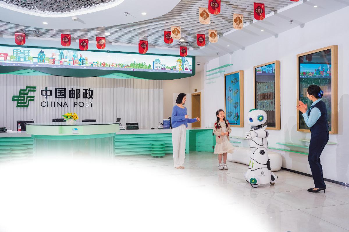 在山東省濟南市趵突泉郵政支局,圓潤可愛的智能機器人“小郵”正與小朋友共舞。