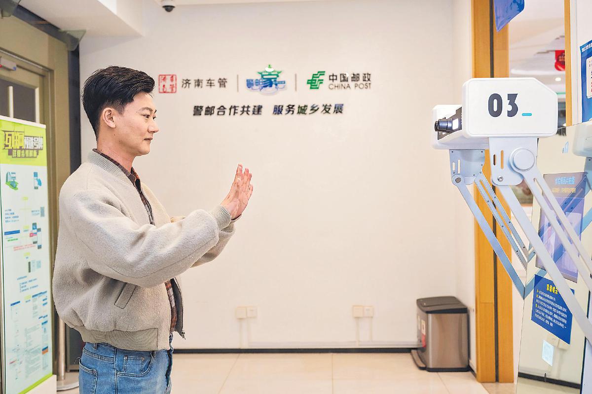 在濟南市趵突泉郵政支局警郵自助終端前,市民“一站式”高效辦理駕駛證換證手續。