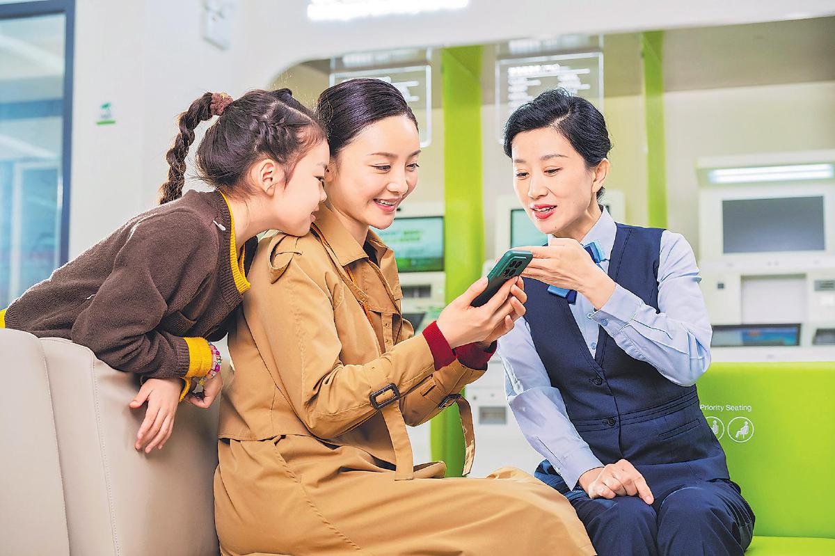 在郵儲銀行濟南市歷下支行,工作人員“一對一”為客戶介紹手機銀行新功能,助力客戶享受智能化服務。