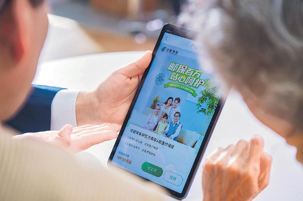 中郵保險濟南市網點內,服務人員向客戶展示健康、養老保險產品的可視化詳情,科技感中傳遞著專業與溫度。