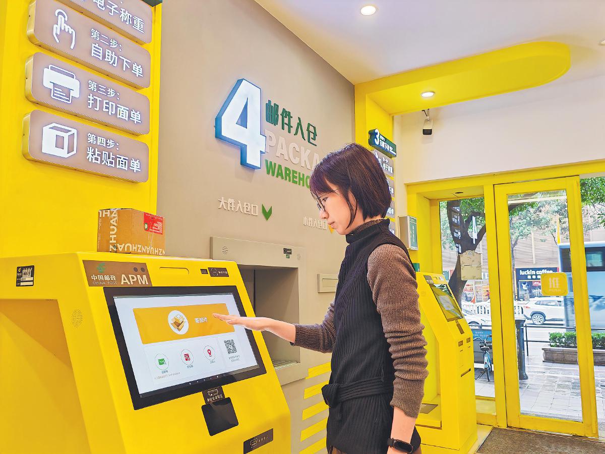 在廣東省深圳市的自助體驗式郵局,客戶通過智能設備輕松完成包裹寄遞。
