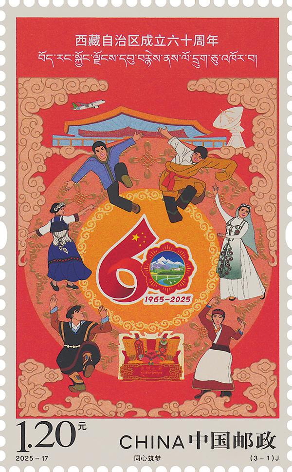 《西藏自治區成立六十周年》紀念郵票今日發行。該郵票1套3枚,郵票圖案名稱為:同心筑夢、美麗雪域、幸福高原。