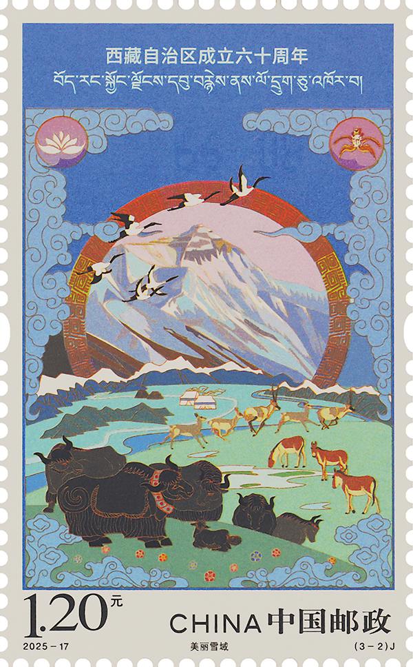 第二枚“美麗雪域”,描繪了漫步、奔跑的牦牛、藏野驢、藏羚羊,飛翔的黑頸鶴,以及陽光映照下的珠穆朗瑪峰等元素,人與自然和諧相處的景象躍然紙上,展現了西藏獨特的生態環境和豐富的生物多樣性,體現出西藏在生態保護與生態文明建設方面取得的顯著成效。