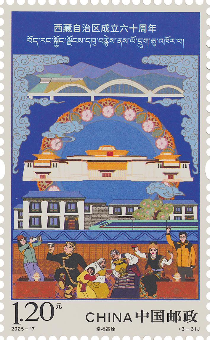 郵票圖案融合藏派繪畫的民族特色與現代裝飾畫的構成藝術語言,色彩絢麗、氣勢宏大、節奏明快,展現出在新時代黨的治藏方略引領下,西藏各族人民攜手共進、同心同行,各項事業取得全方位進步、歷史性成就,各族群眾獲得感、幸福感、安全感不斷提升。