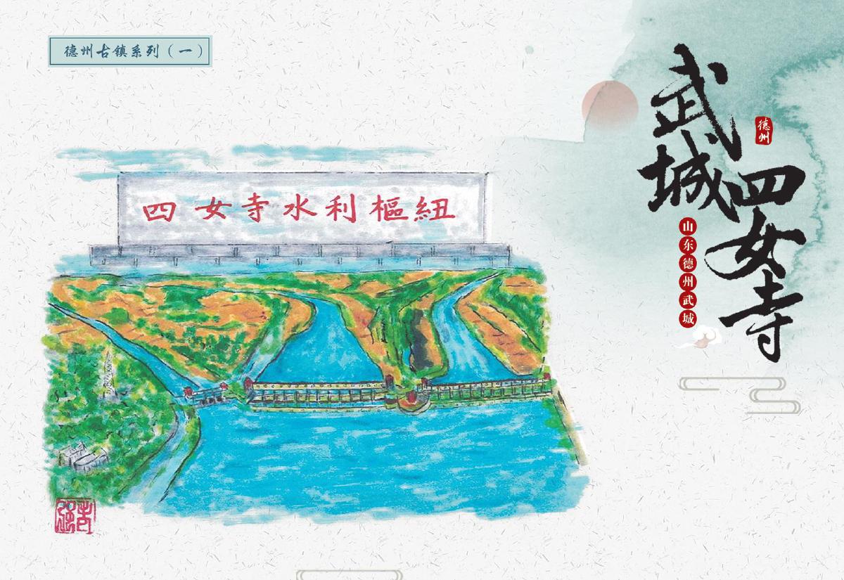此次首發(fā)的文創(chuàng)產(chǎn)品涵蓋郵資封、明信片、郵資機(jī)宣傳戳及主題宣傳戳四大類,每一件都浸潤著四女寺的文化基因。其中,“四女”郵資封(右上圖)以工筆重彩呈現(xiàn)經(jīng)典場景:畫面中四位女子于槐樹下漫步,旁側(cè)牌坊古樸,飛鳥點(diǎn)綴天際,還原“四女侍親,栽槐立誓”的民間傳說,四女常伴樹側(cè),行孝事、話桑麻,樹與人相襯成景,演繹著傳統(tǒng)孝道的溫度,讓古老美德在時(shí)光里熠熠生輝,供后人感懷、傳揚(yáng);而“四女寺水利樞紐”明信片(右下圖)則通過航拍視角與細(xì)節(jié)特寫的結(jié)合,展現(xiàn)這座黃河下游重要水利工程的宏偉氣勢——堤壩蜿蜒如巨龍伏波,閘門啟閉間盡顯古人治水的智慧結(jié)晶,讓現(xiàn)代觀者得以觸摸歷史的溫度。