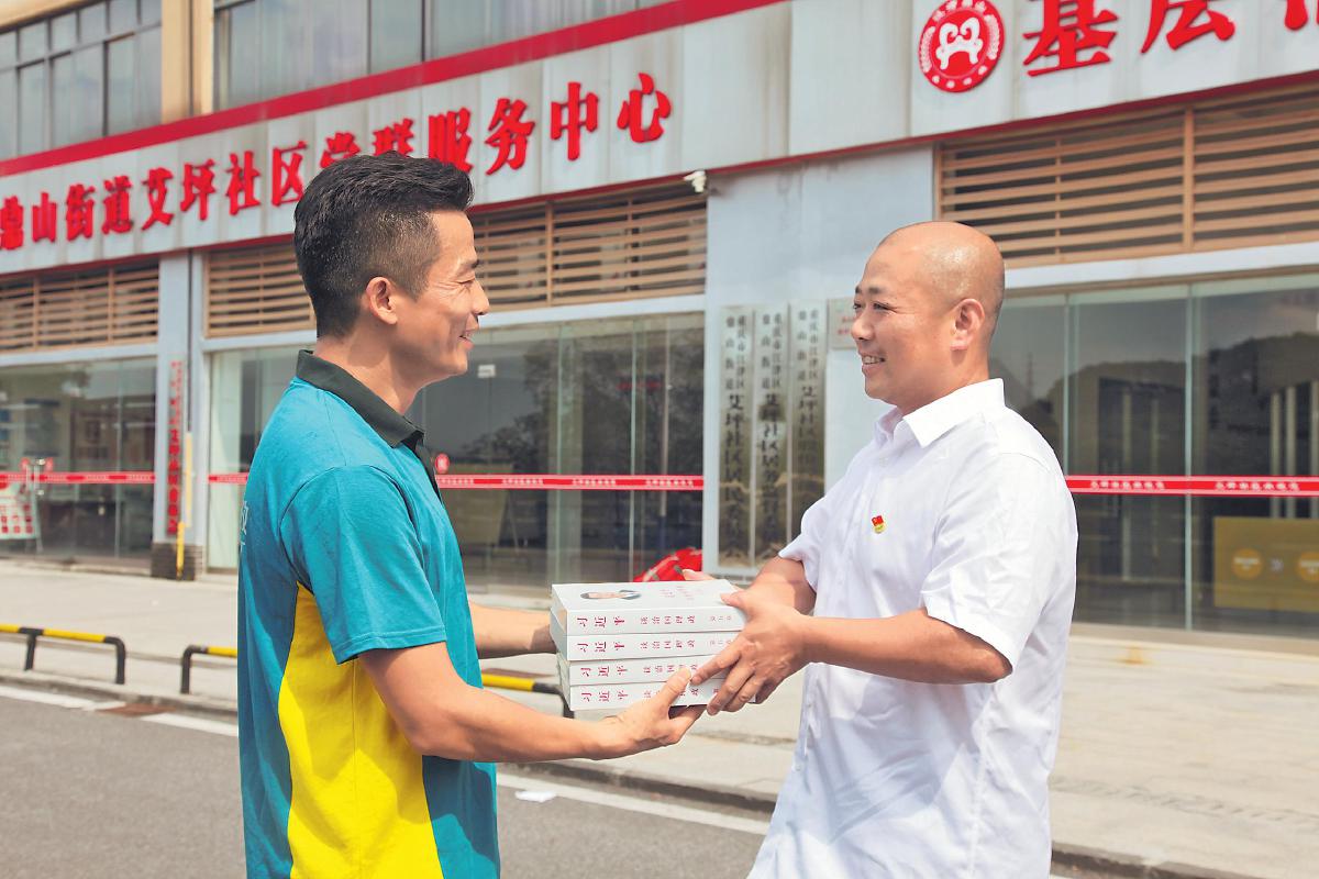 重慶市郵政分公司通過(guò)網(wǎng)點(diǎn)重點(diǎn)展示和視頻聯(lián)播宣傳,確保重大主題圖書(shū)發(fā)行工作高效推進(jìn)。圖為江津郵政投遞員為鼎山街道艾坪社區(qū)及時(shí)配送《習(xí)近平談治國(guó)理政》第五卷。□王春蘭 崔卡 攝影報(bào)道