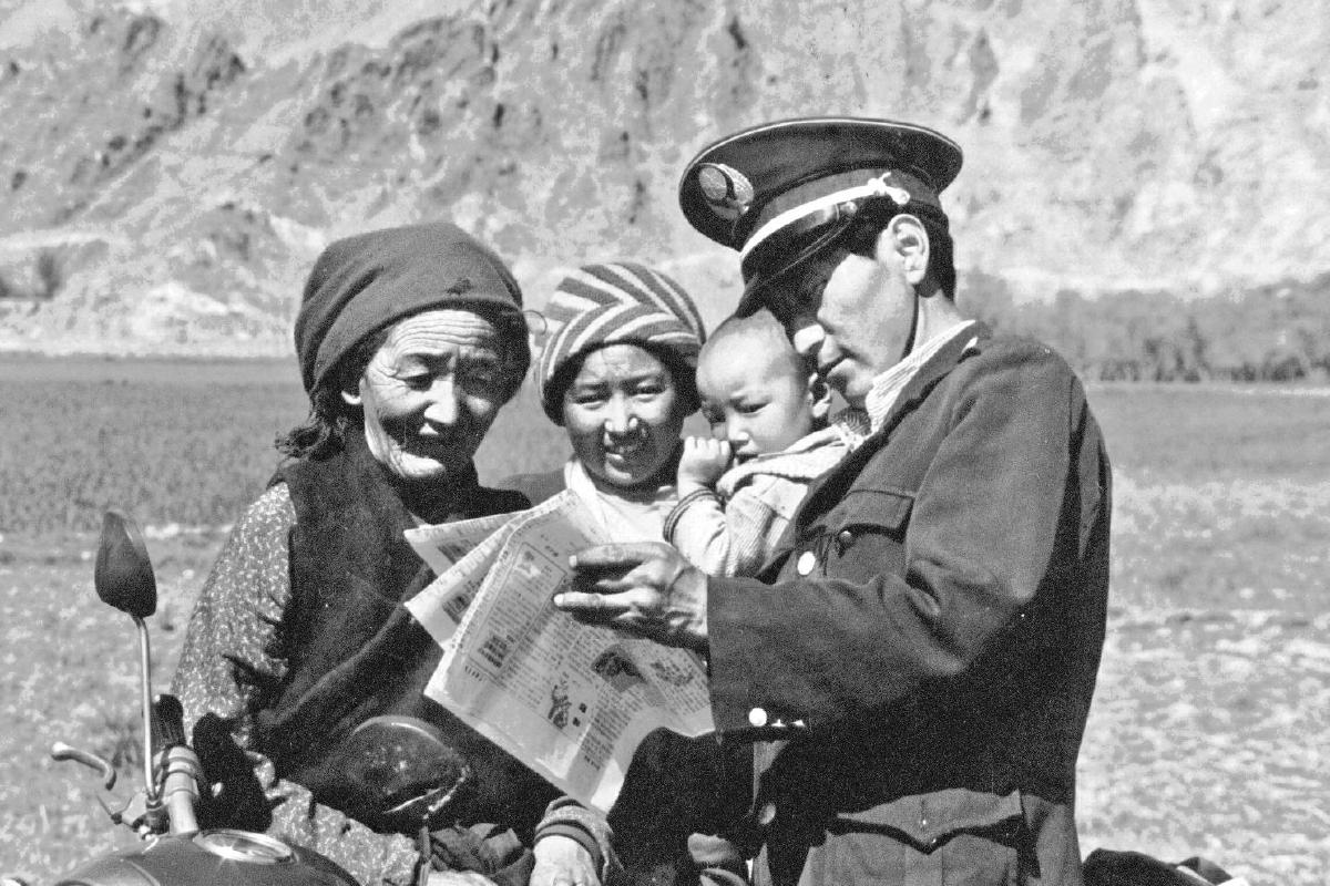 郵遞員為西藏農(nóng)牧民送報讀報。