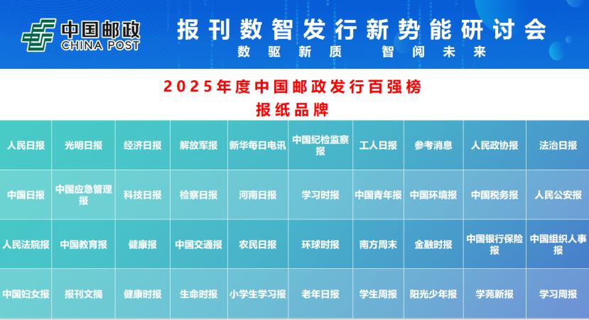 會(huì)上,集團(tuán)公司報(bào)刊發(fā)行局發(fā)布了備受關(guān)注的“2025年度中國(guó)郵政發(fā)行百?gòu)?qiáng)榜”,包括《人民日?qǐng)?bào)》、《光明日?qǐng)?bào)》在內(nèi)的40家報(bào)紙品牌,《求是》、《中國(guó)紀(jì)檢監(jiān)察》等50家期刊品牌,以及參考消息數(shù)字報(bào)、人民日?qǐng)?bào)健康客戶端等10家數(shù)媒品牌上榜。此次百?gòu)?qiáng)評(píng)定綜合考慮了郵發(fā)報(bào)刊的發(fā)行量、品牌影響力、媒體融合發(fā)展的貢獻(xiàn)度等多個(gè)指標(biāo)。此外,報(bào)刊發(fā)行局在此次會(huì)上還與河南日?qǐng)?bào)報(bào)業(yè)集團(tuán)、《人民論壇》雜志社、中國(guó)交通報(bào)社、中國(guó)農(nóng)業(yè)出版社、中航出版?zhèn)髅接邢挢?zé)任公司以及《財(cái)經(jīng)》雜志等多家單位簽訂戰(zhàn)略合作協(xié)議,標(biāo)志著中國(guó)郵政在報(bào)刊數(shù)智發(fā)行領(lǐng)域合作網(wǎng)絡(luò)的進(jìn)一步拓展。