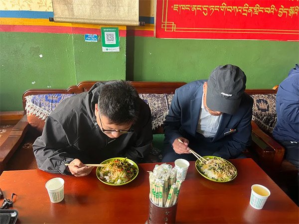 午飯時間,鄉(xiāng)政府旁的索多藏餐館里擠滿了來用餐的人。有觀光的游客,有像我們一樣到這里工作的外鄉(xiāng)人,還有本地的老百姓。記者和曲巴一起回憶起10年前在普瑪江塘只能吃面包、泡面的采訪經(jīng)歷。曲巴說:“現(xiàn)在鄉(xiāng)上開了3家餐館,大家也能吃上熱乎乎的飯菜了。”記者點了一份青椒肉絲蓋飯,曲巴要了一份小白菜蓋飯。我們吃得一干二凈!