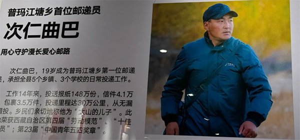 離開普瑪江塘前,普瑪江塘鄉(xiāng)黨委副書記、人大主席洛桑久乃熱情地邀請采訪組參觀位于鄉(xiāng)政府內(nèi)的邊境紅色教育基地。在普瑪江塘杰出人物展區(qū),記者一下就看到了次仁曲巴事跡的展板,2019年他榮獲了第23屆“中國青年五四獎?wù)隆薄B迳>媚顺錆M感慨地說:“中國郵政和我們地方黨委、政府一樣,無論誰來誰走,都會永遠堅守在這高寒的邊境線上。鄉(xiāng)親們需要我們,國家需要我們!”
