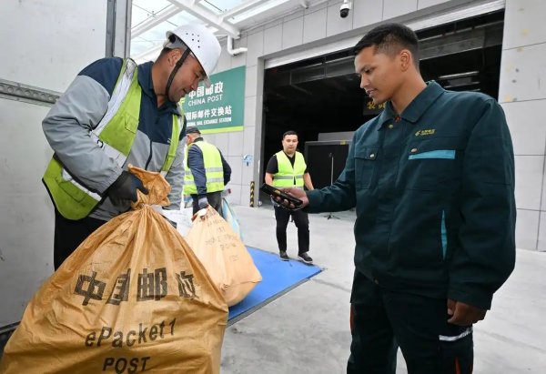 在新疆霍爾果斯國(guó)際郵件交換站,中國(guó)郵政工作人員(右一)在為即將交換到哈薩克斯坦郵政的郵包掃碼轉(zhuǎn)運(yùn)。據(jù)了解,霍爾果斯國(guó)際郵件交換站于2022年7月正式運(yùn)營(yíng),以進(jìn)出口物流渠道為支持,為跨境電商產(chǎn)業(yè)鏈上下游提供倉儲(chǔ)和快遞物流綜合解決方案。承運(yùn)中國(guó)至中亞多國(guó)、俄羅斯以及歐洲國(guó)家的出口國(guó)際郵件。3年來,累計(jì)國(guó)際郵件交換量2026噸(9月11日攝)。新華社記者 李賀 攝