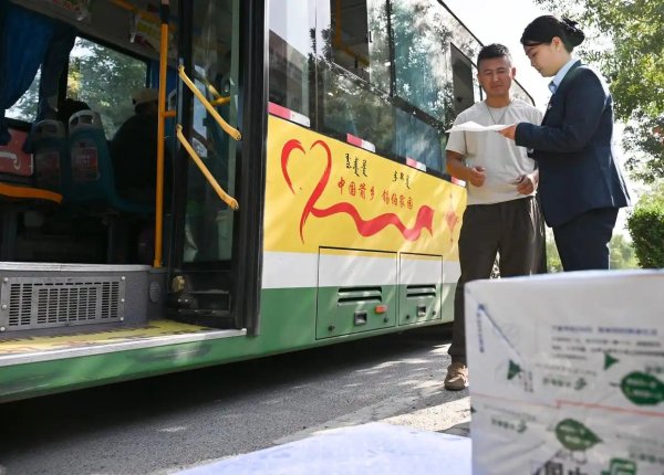 新疆伊犁州米糧泉鄉(xiāng)米糧泉村郵政所工作人員(右)在同公交車司機(jī)交接郵件。近年來,伊犁州郵政分公司通過和公交公司合作,利用公交車的冗余載能將郵件投送到村級(jí)郵政所,為當(dāng)?shù)馗髯迦罕妿肀憷?月8日攝)。新華社記者 李賀 攝