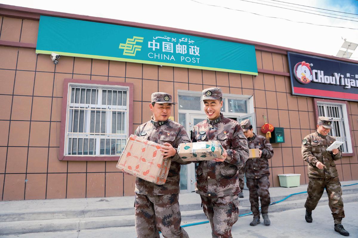 直達(dá)新疆葉城縣三十里營房地區(qū)的郵路開通后,駐地部隊(duì)官兵從郵政服務(wù)點(diǎn)高興地取出包裹。