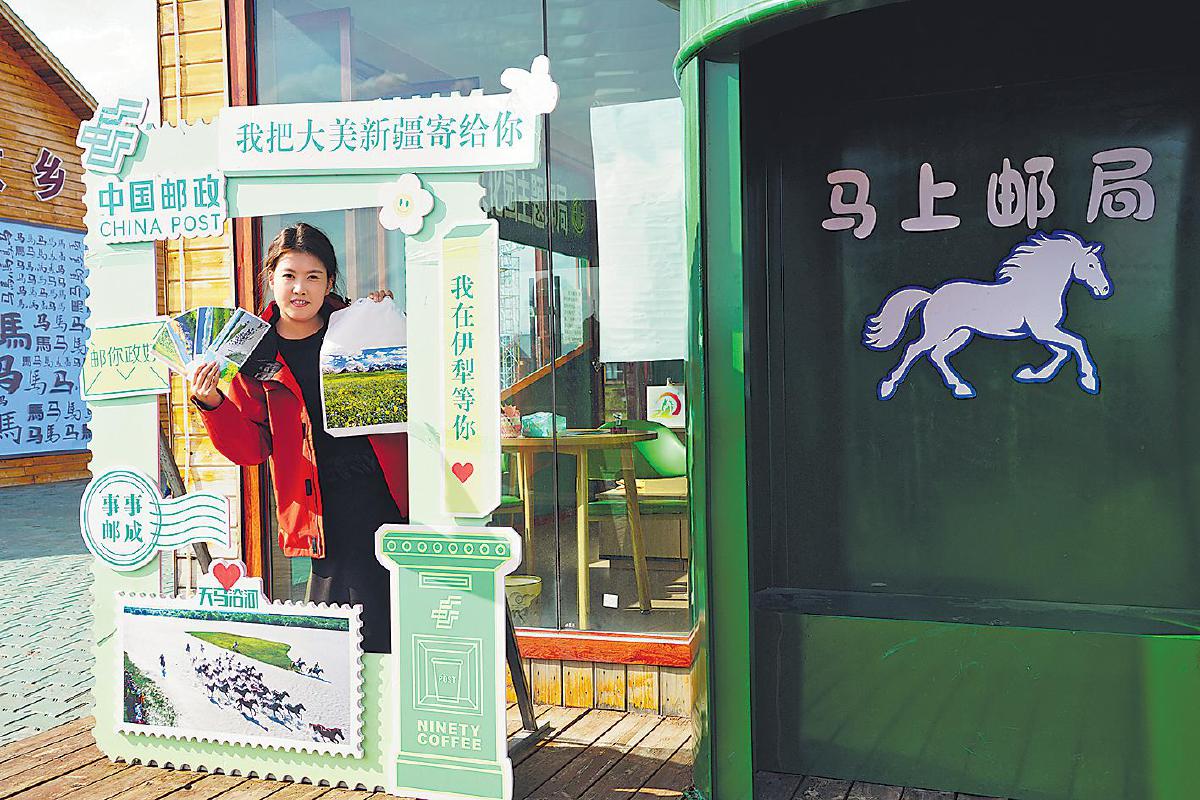 在昭蘇縣天馬文化園,主題郵局以豐富多彩、獨(dú)具創(chuàng)意的文創(chuàng)服務(wù)為游客留下美好回憶。