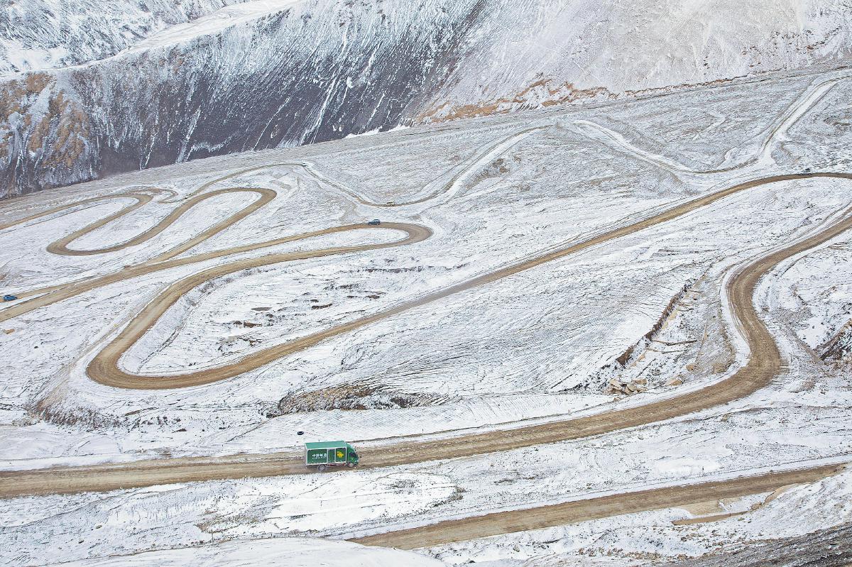 郵車行駛在蜿蜒的喀喇昆侖山路上。