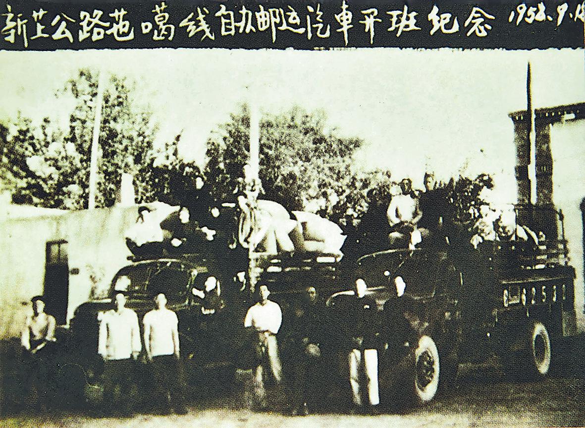 1958年,新藏汽車郵路郵運(yùn)班車待發(fā)。