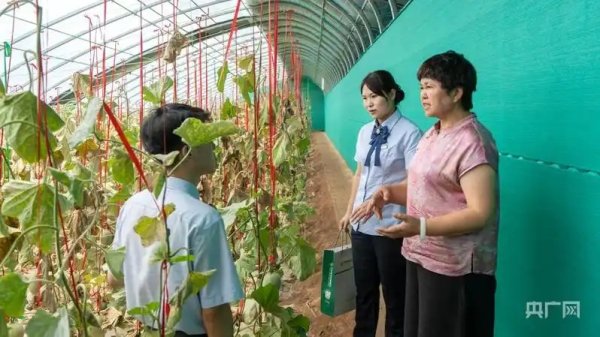 郵儲(chǔ)銀行武山縣支行客戶經(jīng)理查看新式冬暖大棚種植情況(央廣網(wǎng)發(fā) 郵儲(chǔ)銀行甘肅省分行供圖)