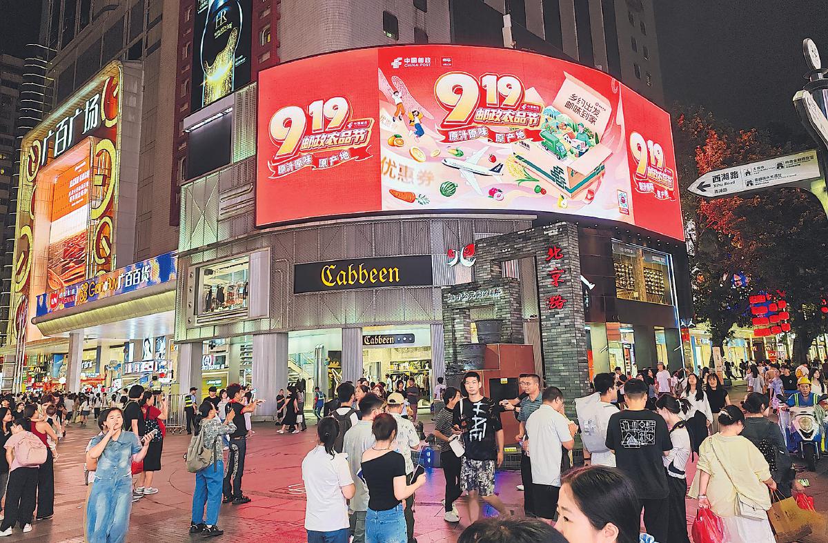 9月23日,2025年“中國農民豐收節”拉開帷幕。當天,“919”郵政農品節宣傳大屏在北京、廣州、深圳、武漢、長沙、南昌、哈爾濱多地繁華街區亮相,以都市核心商圈的流量勢能,提升郵政農品節的品牌知名度與行業影響力。圖為在廣州市北京路,“919”宣傳大屏閃亮奪目。