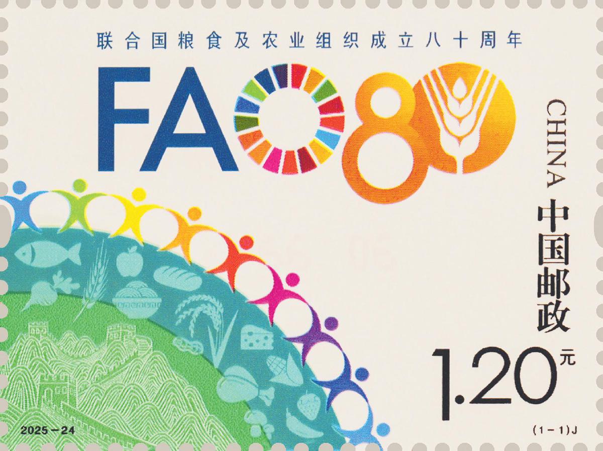 本套郵票圖案以聯合國糧食及農業組織八十周年紀念標識為主體,左側的藍色環形底色象征地球家園,前景展現了多樣美食以及象征中國的長城元素,結合并肩攜手的人物剪影,呼應2025年世界糧食日“手拉手共倡多樣美食,聚合力同創美好未來”主題。