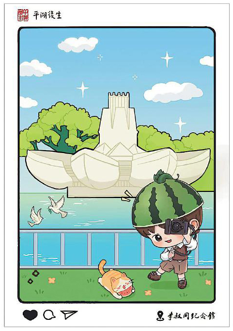 在項目推進過程中,設計團隊與平湖市委宣傳部進行了多輪溝通,最終獲得政府層面的認可與支持。設計構思上,團隊深入挖掘平湖地方文化資源,注重將城市肌理與精神符號融入方寸之間。彩戳及手繪明信片的圖案不僅選取了當地代表性景觀,更著重突出了與一代文化巨擘李叔同相關的元素,如作為城市文化新地標的東湖李叔同紀念館。該紀念館于今年5月完成升級并重新開放,成為集中展示李叔同生平與藝術成就的重要窗口,也為彩戳、手繪明信片設計提供了豐富的視覺素材和內涵支撐。手繪明信片還融入了卡通人物形象,貓咪與戴西瓜帽的動漫人物形象活潑俏皮,細節處滿是巧思。