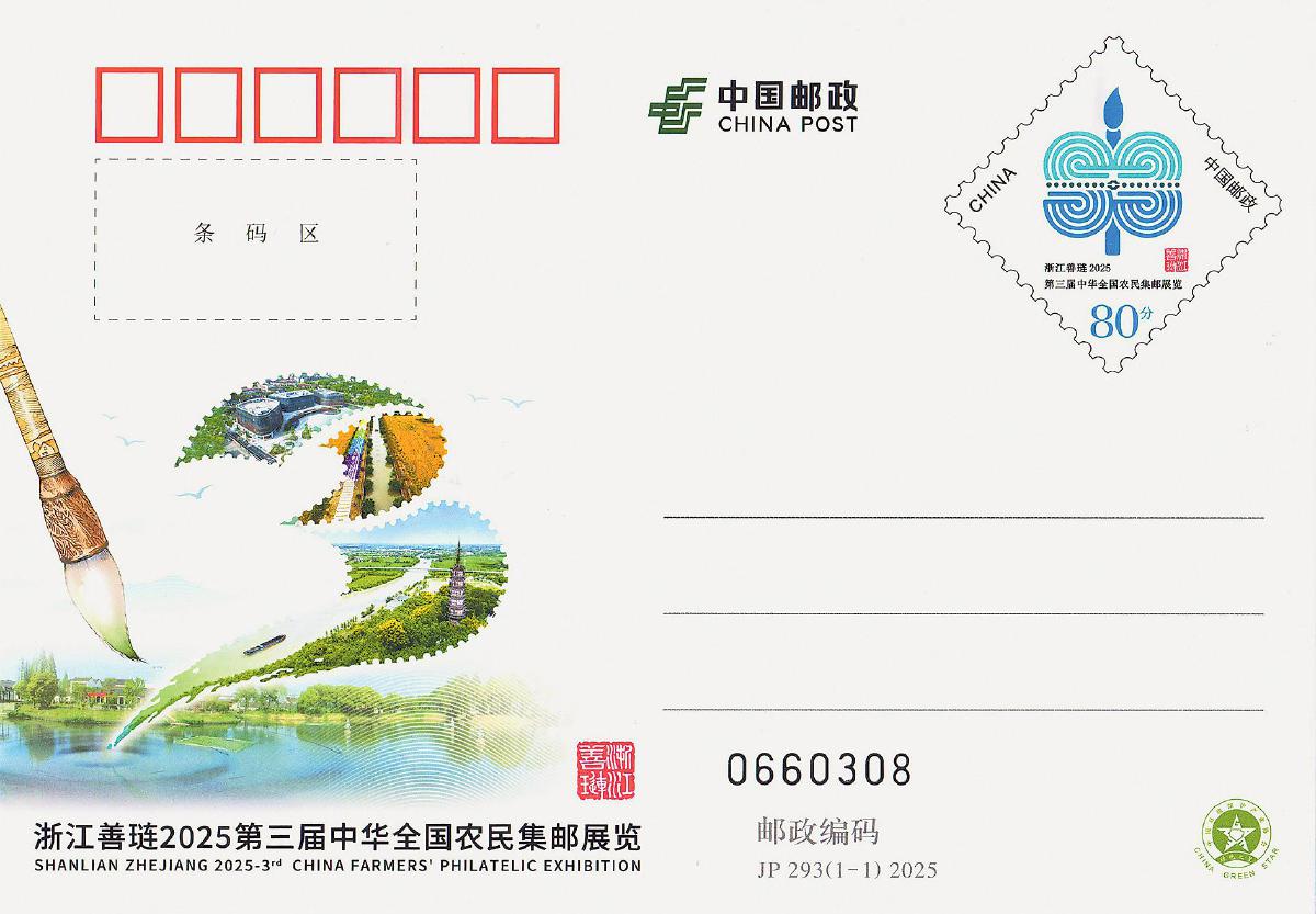 展覽集中展示全國28個省級郵協(xié)精選的146部、450框“三農(nóng)”題材郵集,涵蓋傳統(tǒng)、郵政歷史、專題等10個競賽類別,特別增設19部、30框書信集郵非競賽單元。中國郵政為本次郵展特別發(fā)行《浙江善璉2025第三屆中華全國農(nóng)民集郵展覽》紀念郵資明信片1枚。