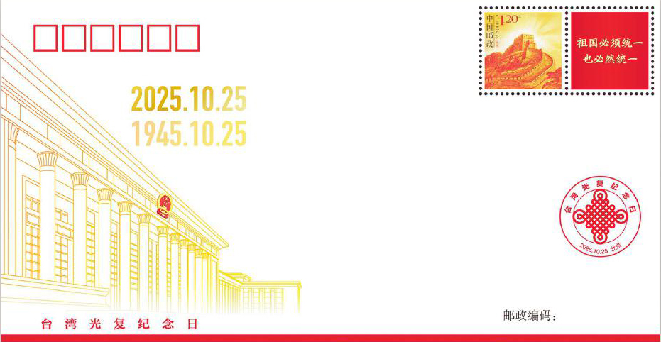 10月25日,《臺灣光復紀念日》紀念封發(fā)行。該紀念封由中共中央臺灣工作辦公室監(jiān)制,中國集郵有限公司發(fā)行,貼《長城》個性化服務專用郵票,印紀念戳。