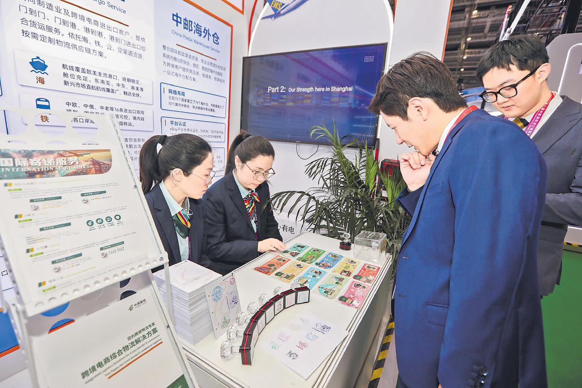 11月5日—10日,第八屆中國國際進口博覽會(以下簡稱“進博會”)在上海舉行。本屆進博會有155個國家、地區和國際組織參與,4108家境外企業參展,規模再創新高。上海市郵政分公司特為本屆進博會啟用并發行了《第八屆中國國際進口博覽會》YFM118E型郵資機戳和紀念封各1枚,受到廣大集郵愛好者和參展觀眾的歡迎。同時,中國郵政EMS連續第八年受邀參展,展示了其全球寄遞網絡、境外倉配矩陣等六大板塊成果,呈現郵政從“郵商并舉”向“郵商貨倉并進”的轉型路徑,為跨境貿易提供全鏈條解決方案。圖為觀眾被EMS展位上的特色明信片所吸引。