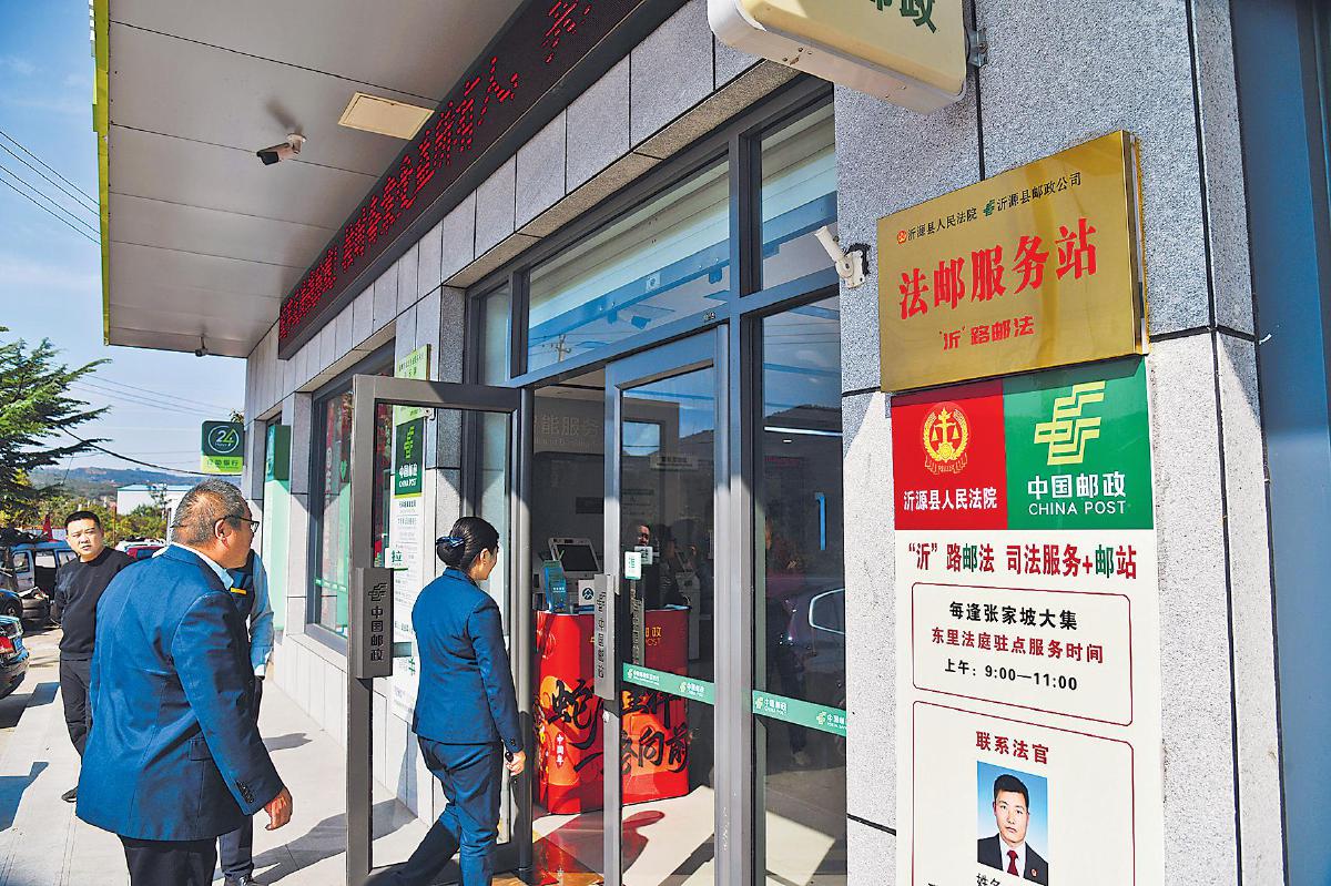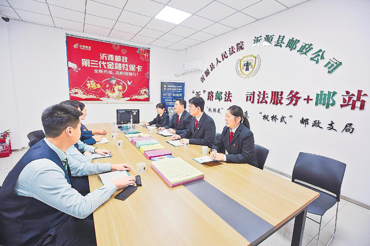 張家坡,山東省淄博市沂源縣東南30公里處的小鎮(zhèn)。鎮(zhèn)上的張家坡郵政支局里,藏著一項(xiàng)不尋常的服務(wù)——法郵服務(wù)站的司法服務(wù)。這是山東省高級(jí)人民法院與山東省郵政分公司攜手打造的“楓橋式”基層治理新樣板,也是司法服務(wù)“貼地而行”的生動(dòng)實(shí)踐。群眾在“家門口”的郵局就能進(jìn)行立案、咨詢、調(diào)解,甚至參與庭審;法律不再遙不可及,而是“一路有法、‘沂’路‘郵法’”。