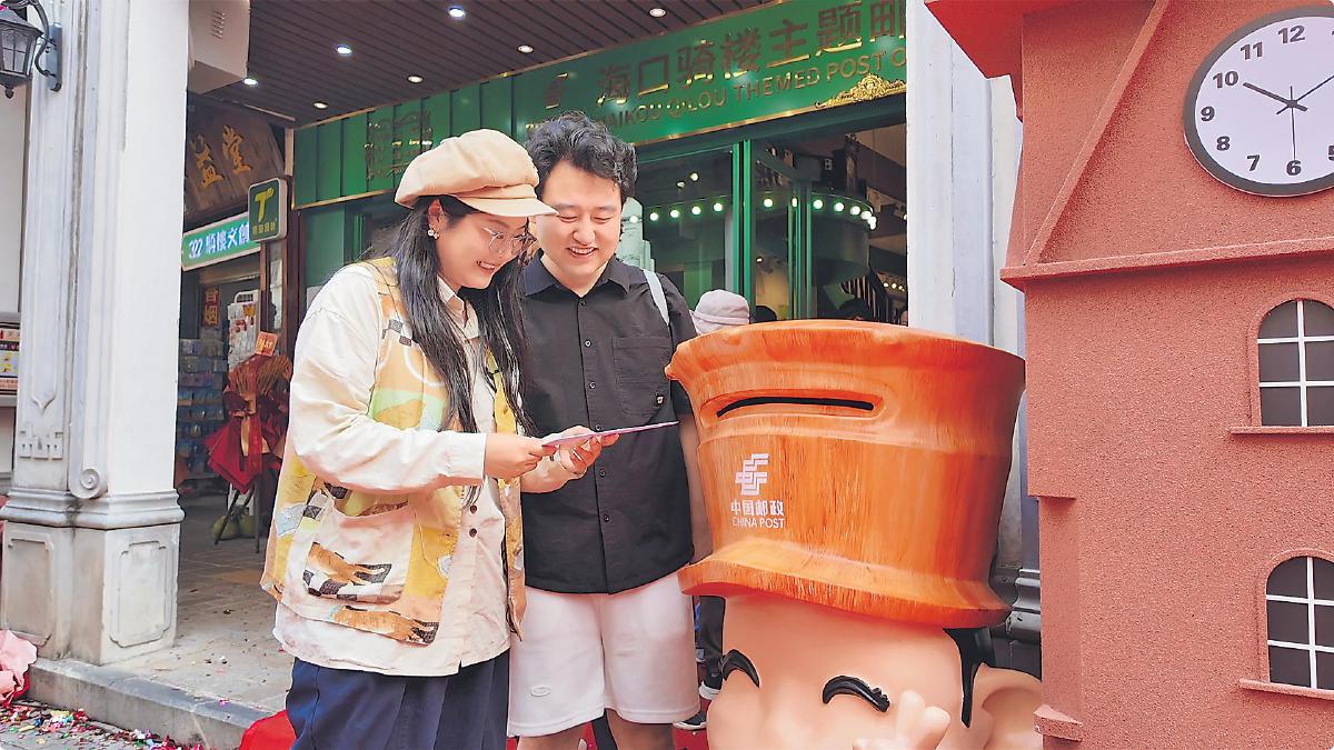 海口騎樓老街是首批“中國歷史文化名街”。騎樓主題郵局位于老街中心位置,郵局一樓設有打卡蓋戳區、文創產品區、集郵品區、政務圖書區、海南特產區和郵福咖啡吧,展架上擺滿了騎樓燈籠冰箱貼和騎樓主題郵局紀念封、主題郵冊等集郵文創產品;二樓陳列著郵政老照片、珍貴郵票,復原的老郵政辦公區成為熱門打卡點位。圖為一對來自甘肅的新婚夫婦在騎樓主題郵局郵寄紀念封,留下一份蜜月度假的美好記憶。