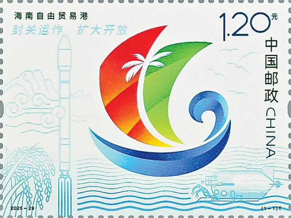 12月18日,海南自由貿(mào)易港將正式啟動(dòng)全島封關(guān)運(yùn)作。這一重大舉措,標(biāo)志著中國(guó)對(duì)外開(kāi)放進(jìn)入全新階段,對(duì)于加快吸引全球優(yōu)質(zhì)要素集聚、促進(jìn)海南自貿(mào)港高質(zhì)量發(fā)展具有重要意義。郵票畫(huà)面以海南自由貿(mào)易港形象標(biāo)識(shí)為主體,左上角表現(xiàn)了“封關(guān)運(yùn)作 擴(kuò)大開(kāi)放”宣傳語(yǔ);畫(huà)面背景繪有五指山、稻穗、火箭、深海勇士號(hào)載人潛水器、數(shù)據(jù)傳輸(無(wú)色熒光)等元素,展現(xiàn)出“五向圖強(qiáng)”高質(zhì)量發(fā)展新圖景,寓意海南自貿(mào)港向著加快建設(shè)具有世界影響力的中國(guó)特色自由貿(mào)易港目標(biāo)奮勇前進(jìn)。