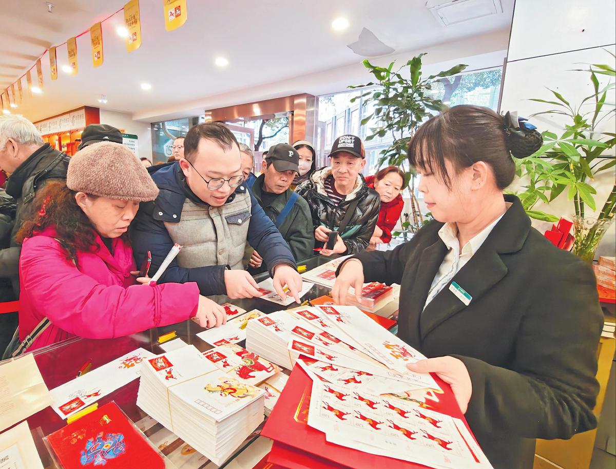1月5日,《丙午年》特種郵票全國發行,以“馳躍宏圖、萬駿臻福”的文化意象,將傳統生肖底蘊與時代活力傳遍全國。各地郵政營業網點聯動構建生肖文化傳播矩陣,讓這套承載奮進寓意與吉祥期許的“國家名片”,成為“十五五”開局之際的全國性文化熱點。老郵迷品鑒方寸匠心,年輕人追捧文創潮流,掀起全民集藏熱潮。圖為貴州省貴陽市噴水池郵政營業所工作人員熱情地向市民講解馬年生肖郵票的設計理念與印制特色。此外,該營業所還特別準備了開陽馬場生肖原地戳等特色紀念郵戳,切實滿足廣大郵迷需求。