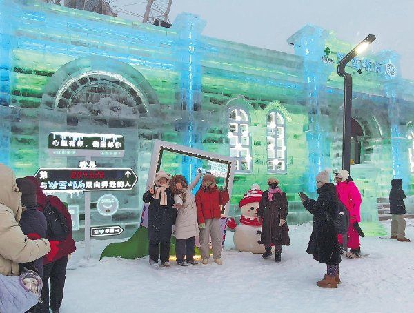自第二十七屆哈爾濱冰雪大世界開園至今,冰雪郵局日均接待游客近5000人,元旦假期每天接待游客超萬人。今年的冰雪郵局遷移至園區內地標性建筑——“雪花摩天輪”之下,采用“暖屋+冰燈包裹”的建筑設計。冰雪郵局推出的近300種涵蓋地方風光與冰雪文化的封片及文創產品受到游客歡迎,門口的冰雕郵筒、雪娃娃和明信片留影框也吸引了眾多游客駐足打卡。