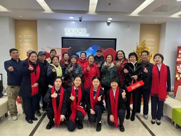 活動(dòng)尾聲,每位參與者手中都緊握著福字與春聯(lián),客戶與工作人員圍攏合影,有人比出“耶”的手勢(shì),有人高高豎起大拇指,紅圍巾在鏡頭前連成一片溫暖的底色。